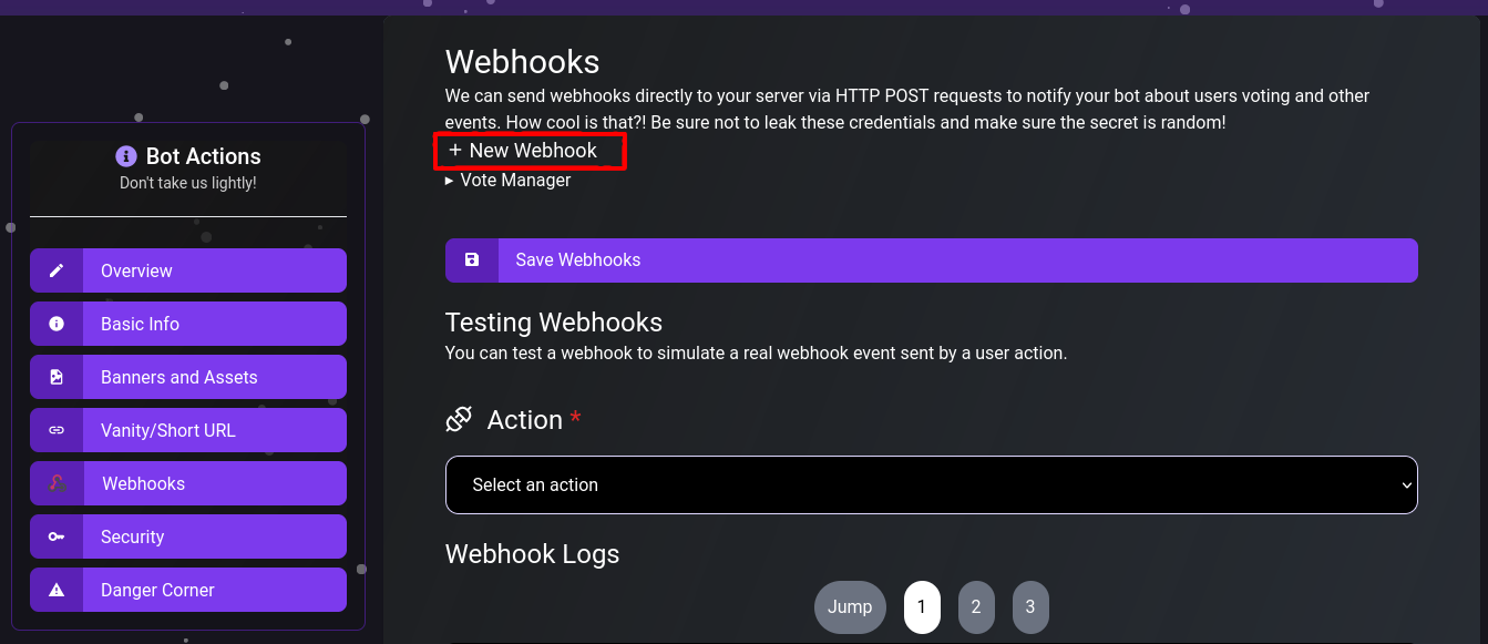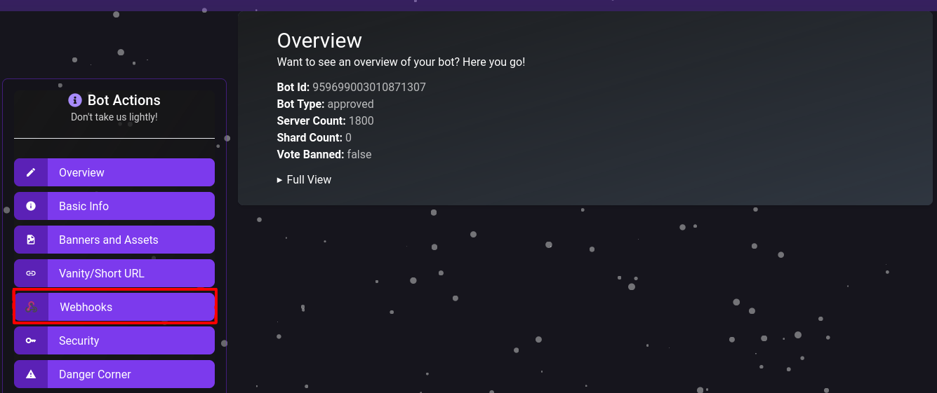 You should be taken to a page that looks like the above image. Click on the sidebar option labelled **Webhooks** to view your bots webhooks
