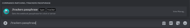 If you forget or lose your passphrase you can run the `/trackers passphrase` command. Select **Bot** for the type then choose the tracker from the options and run the command