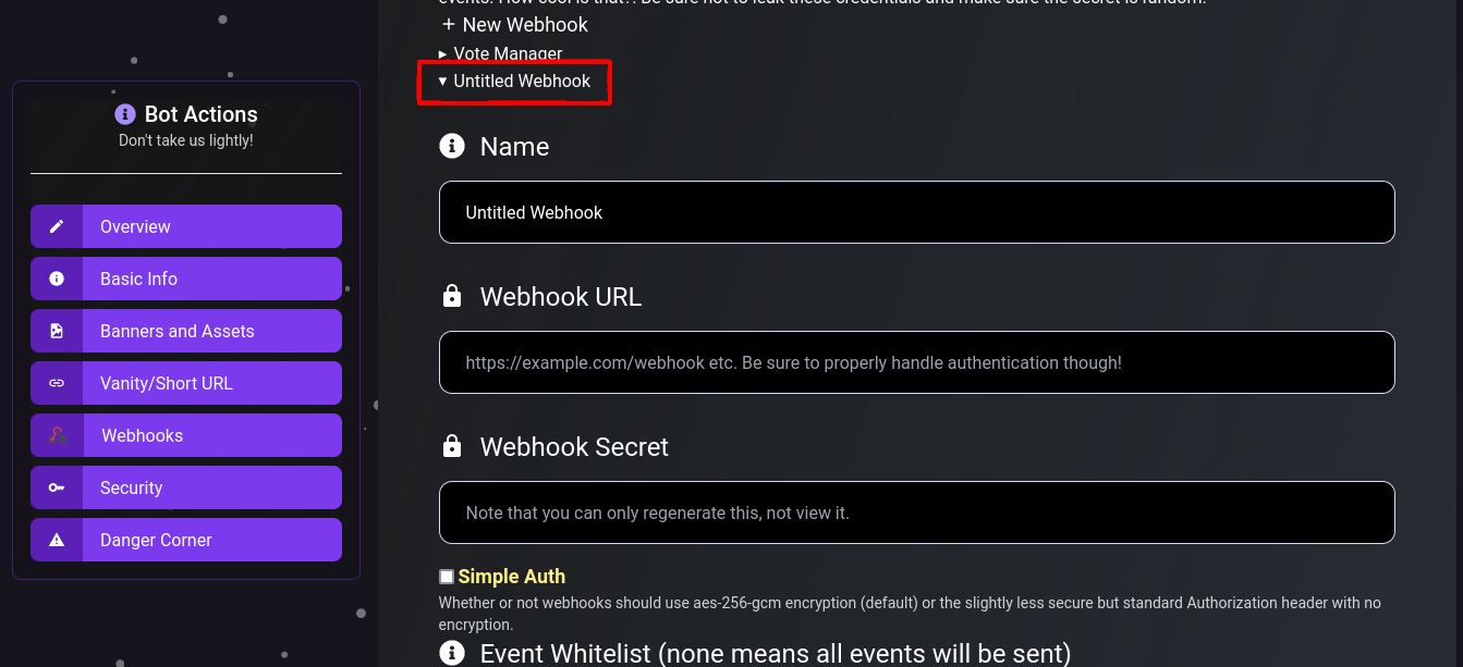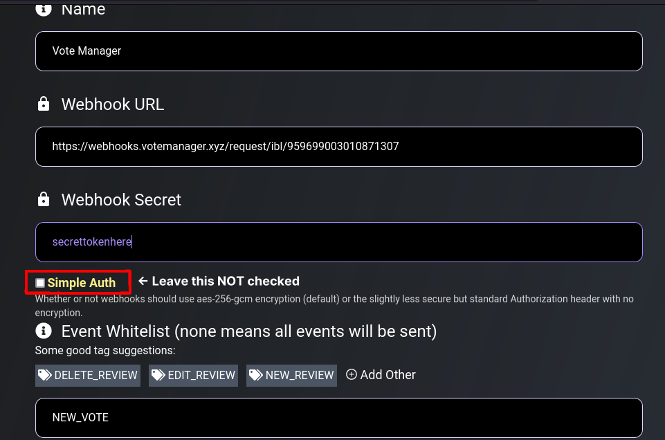 Enter the provided Passphrase into the **Webhook Secret** field. Ensure that **Simple Auth** is left unchecked and the **Event Whitelist** contains **NEW\_VOTE** or is left empty